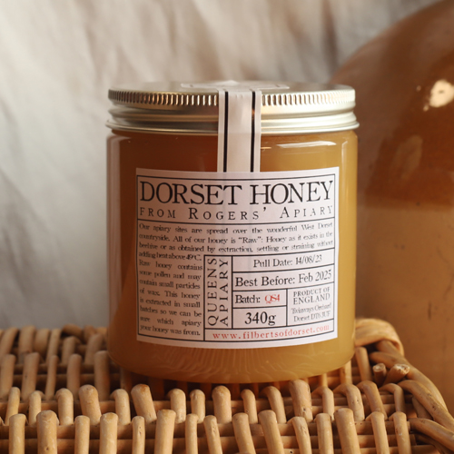 A clear, plastic jar of honey with a white label standing on a basket with a white backdrop.